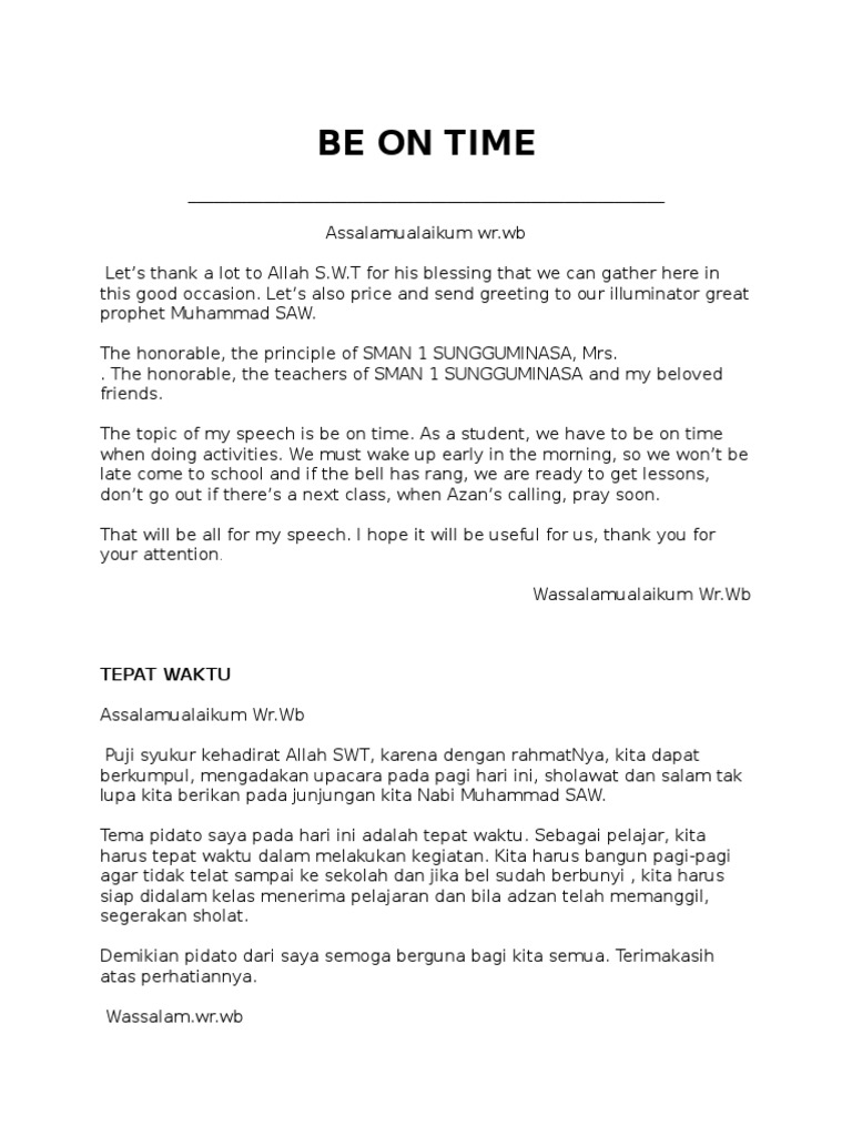 Contoh pidato ini bisa Anda. Pidato Singkat Bahasa Inggris Tentang Disiplin. Biasanya kegiatan tersebut dilakukan oleh seseorang untuk berorasi di depan khalayak ramai.